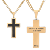 Krzyżyk stalowy czarno-złoty z grawerem – łańcuszek 60 cm